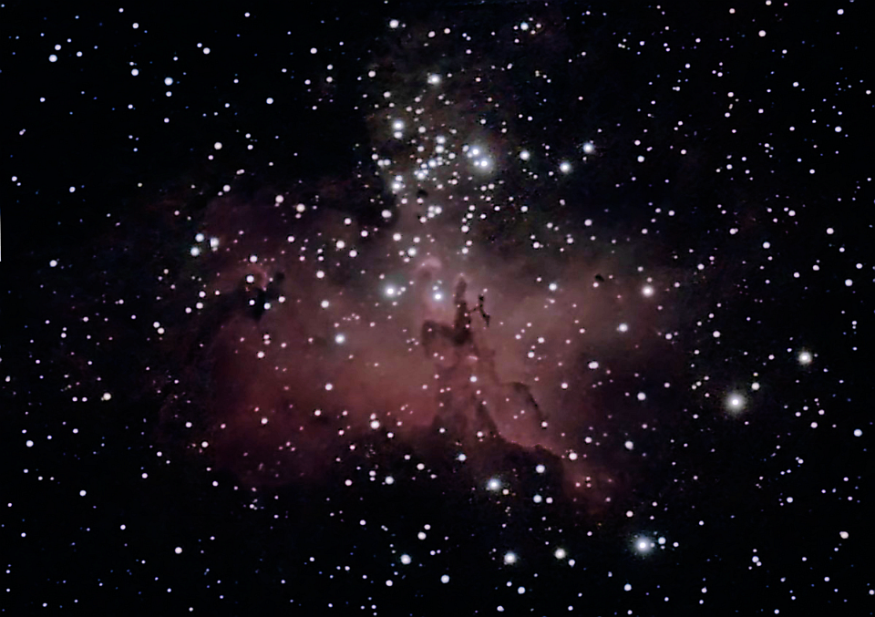 1M16 Eagle Nebula. Taken at home on 04/14/05. Meade LX200 GPS 8" scope DSI-C camera, alt/az mount. 10-20 seconds/image, total time 65 minutes in center.