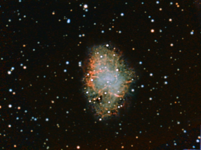 1M1 Crab Nebula, a remnant from the supernova of 1054 AD. Taken at home on 11/26/05. Meade RCX400 10" scope, DSI-C camera, f/3.3 focal reducer, alt/az mount. 10 seconds/frames, total time 149 minutes.