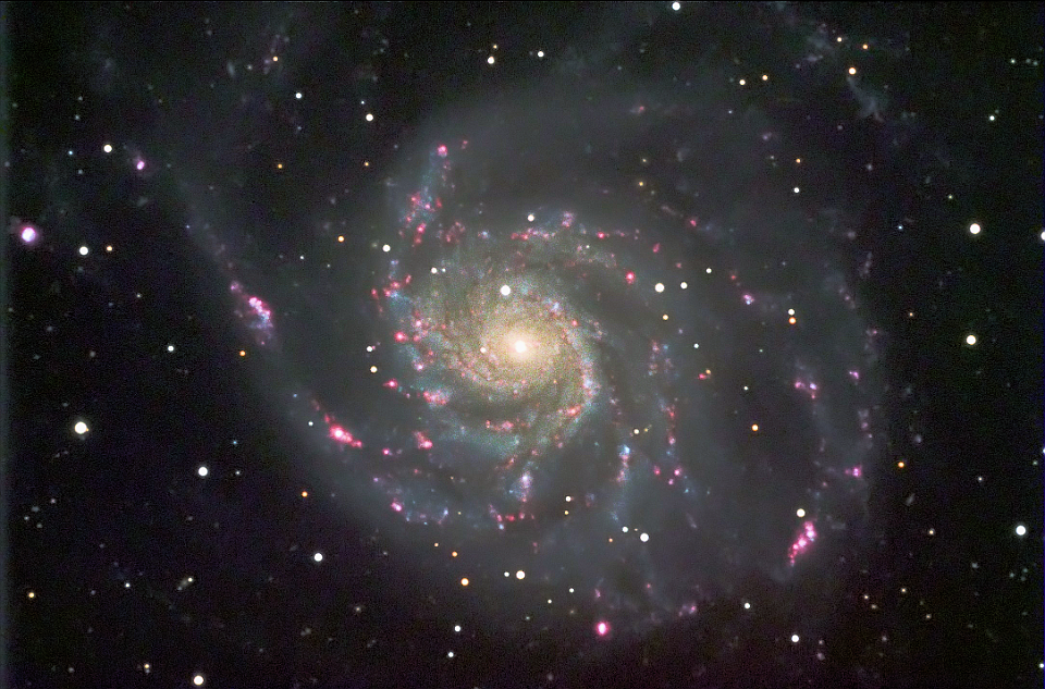 36M101 Pinwheel Galaxy in Ursa Major. Taken at home on 06/04/08 and 06/06/07. Meade RCX400 10" scope, SBIG ST-10XME camera. LRGB data taken at 180 seconds/frame. Ha data taken at 300 seconds/frame. Total time 358 minutes (LRGBHa = 120:21:21:21:175).