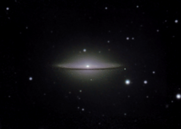 38M104 Sombrero Galaxy. Taken at home on 05/22/05 and 05/26/05. Meade LX200 GPS 8" scope, DSI-C camera. 10 seconds/image, total time 201 minutes. 2x2 drizzle with extra images in the center.