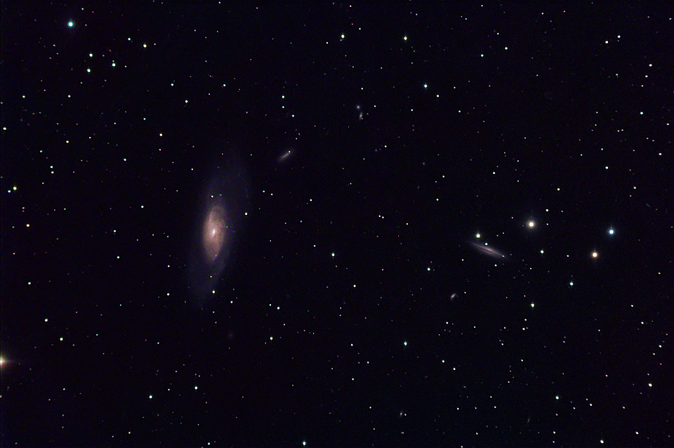 31M90 Spiral galaxy in the Virgo cluster. Also shows IC 3583, which is close enough to interact with M90. In addition, two fainter galaxies are just visible in the distance. Taken at H2O and home on 05/25/06, 05/28/06 and 05/29/06. Meade RCX400 10" scope, DSI-Pro camera 10 to 30 seconds/image, total time 150 minutes.