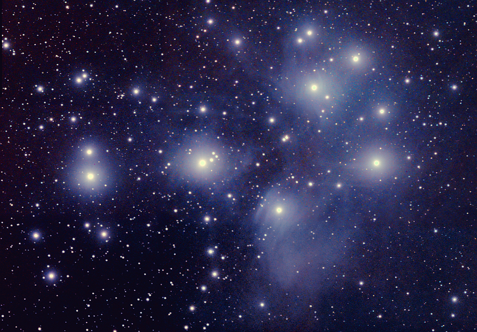 19M45 The Pleiades; The Seven Sisters. Taken at home on 01/06/07, 01/09/07 and 01/10/07. Orion ED80, f/6.3 focal reducer, DSI-C camera. The image is a 3x3 mosaic (9 sectors), 10-11 frames/sector, 180 seconds/frame, total time 4.6 hours.