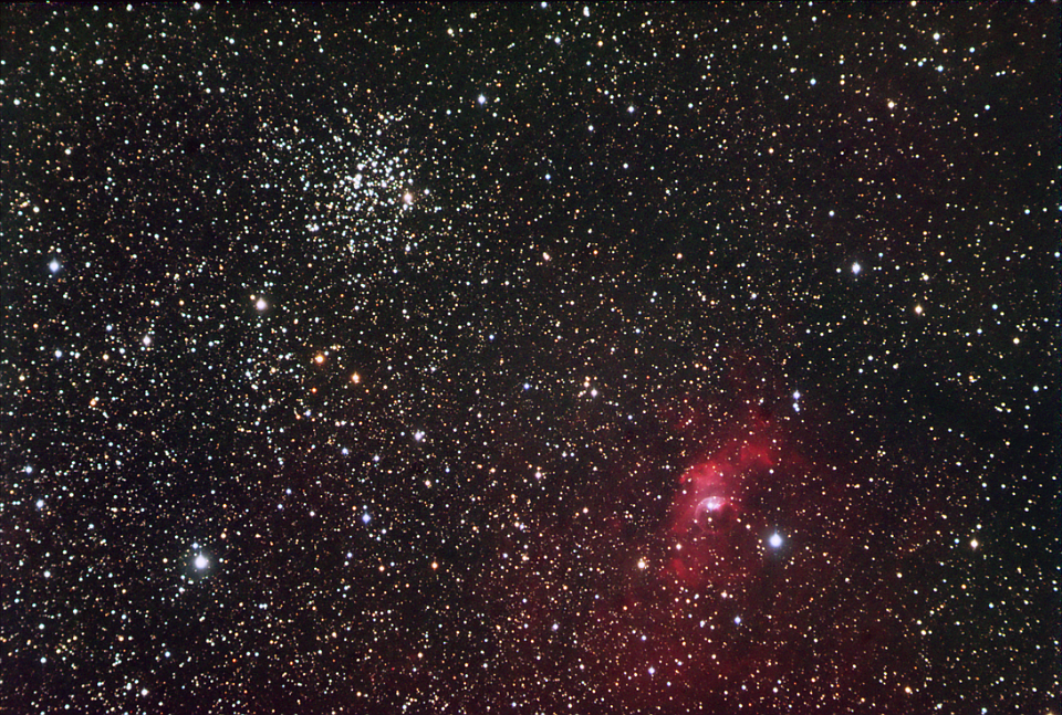 21M52 M52, which is an open cluster; and NGC 7635, which is better known as the Bubble Nebula. Taken at home on 08/26/08. Orion ED80 scope, ST-10XME camera. 60 seconds/frame, total time 120 minutes (LRGB=60:20:20:20).