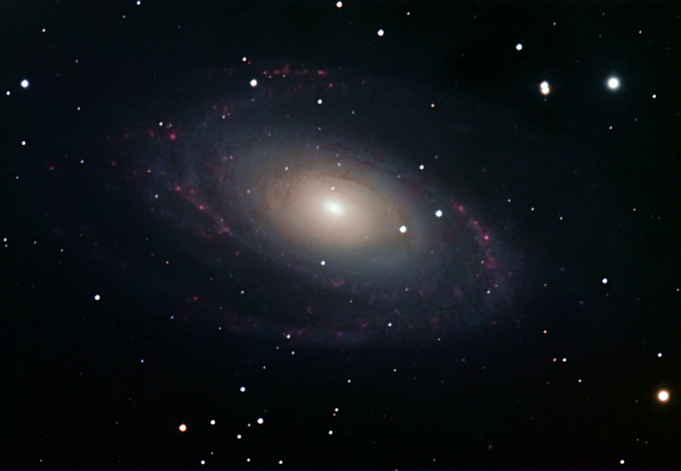29M81 Spiral galaxy in Ursa Major. Taken at home on 04/10/08, 04/11/08, and 04/17/08. Meade RCX400 10" scope, ST-10XME camera. 300 seconds/frame for L and Ha, and 120 seconds/frame for RGB. Total time 277 minutes (LRGBHa = 185:20:20:22:30). Ha picture used only to brighten the star forming regions.