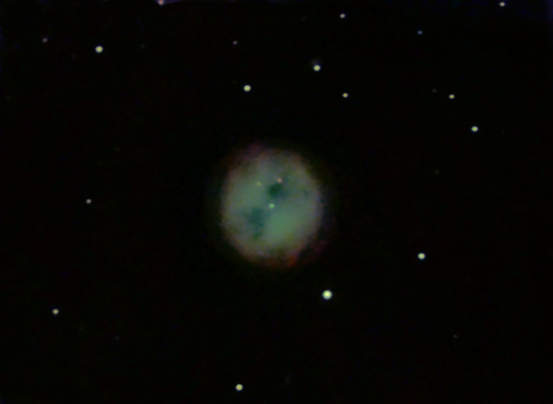 34M97 Owl Nebula. Taken at home on 04/04/05 and 04/09/05. Meade LX200 GPS 8" scope, DSI-C camera, alt/az mount, various filters. 10 seconds/image, total time 136 minutes.