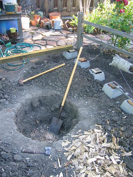 | Tap root is gone | I realized just in time that the pier needed to be off center in order to keep the scope centered. That moved hole away from the tap root somewhat; but not enough to clear it. So I chopped away at the tap root until it was low enough. Had to do this by hand because I couldn't find a stump grinder that would work in a deep hole. | |