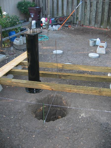 | Hole filled | I refilled the hole to make it 32" in diameter, using a cylindrical form to keep the dirt from falling in. The hole is about 22" deep. This picture also shows the AstroPier, ready to be dropped in place once the concrete is poured. | |