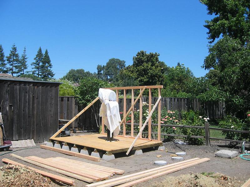 | First wall | The first wall is now in place. The diagonal braces helped keep it in place while I built the other walls. BTW, most of the wood for this project came from Home Depot; so I had to take care to select only good lumber. | |