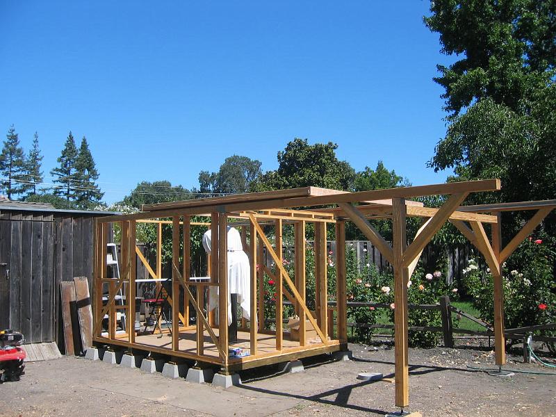 | Roof base | The base for the roll-off roof is done. In this picture, it has been rolled half-way off the building. Along about this time I noticed that the roof didn't clear the walls very well because I used very badly warped lumber for this crucial part. | |