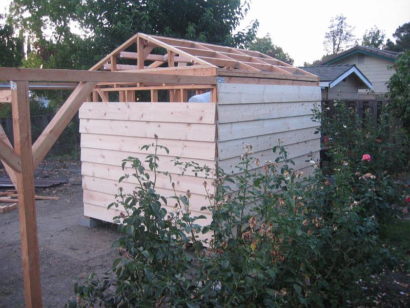 I finished most of the siding for the South wall at 7:15 PM. The last board remains to be done because it requires careful fitting with the roof.