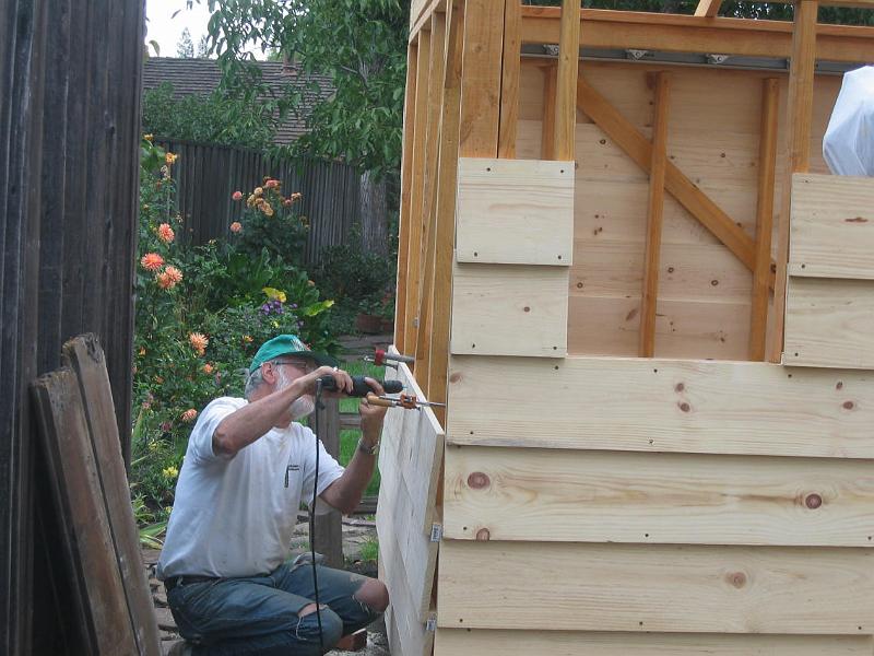 | Installing siding | Here I am installing the siding. The C-clamps hold the boards in place while I screw them down. Incidentally, the siding is nominally 1"x10" pine. But in fact it was really more like 9" wide; so it took more wood than the plans called for. | |