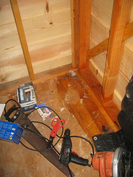 | Leaks! | But a little rain found its way into the observatory. Since the walls weren't finished, this wasn't surprising. But in retrospect, it seems more likely that the water came in along the roller tracks. I have now drilled drainage holes in the bottom of the tracks, and I haven't been bothered by leaks since. But then again as I write this on 1/24/2007, I haven't been bothered by much rain either! So the true test is yet to come. | |