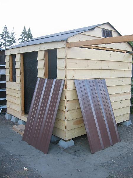 | Roof panels | The steel roofing came in 13' long sections. They had to be cut down to size using tin snips, no simple task for panels with such deep ribs. Unfortunately, the tin snips also tended to flatten out the panels, which caused problems later when I put on the ridge cap. | |