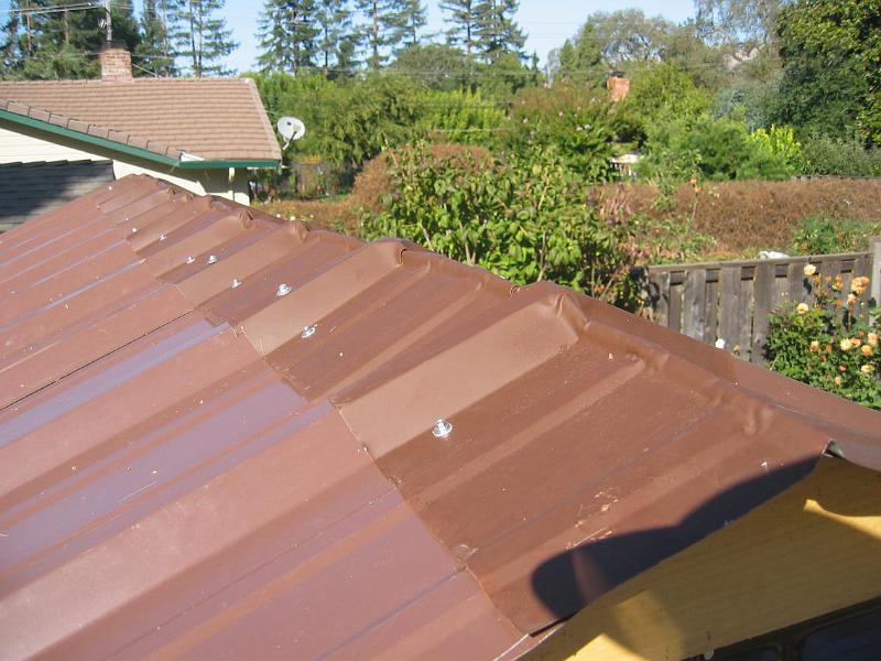 | Ridge cap | I found the roof panels at a lumber store that didn't know what to do with them; so they sold them to me at a bargain price. The store didn't have the matching ridge caps, so I had to guess what to order. I had a choice of the deeply ribbed style that is shown in the picture or a flat style that is more conventional. In retrospect, I would have been better off with the flat style. The panels were distorted when I cut them, and the rib caps were distorted when they were bent to form the ridge line. As a result, the ribs on the panels didn't fit into the ribs on the roof caps, so everything had to be forced into alignment. That's no easy task when you are crawling around on a slippery roof! One other gotcha: the lumber store told me the wrong color to order for the caps; so I had to paint them to match the panels. So much for bargains! | |