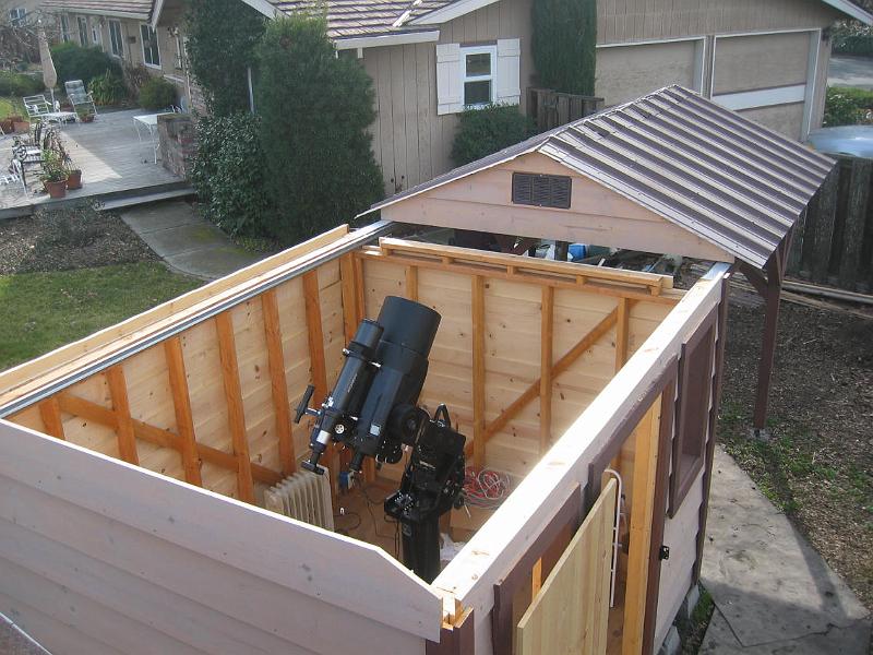 | View from above | This shows my equipment, which includes a Meade 10" RCX400 and an Orion ED80. The RCX400 is mounted on a Mitty wedge, which in turn is mounted on a Le Sueur Astro Pier. I only use the heater on special occasions, such as when I need paint to dry quickly or I want to protect the equipment. | |